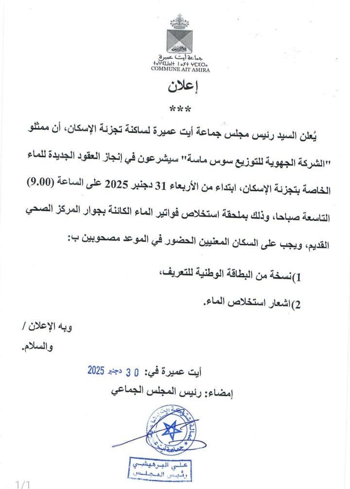 الرئيسية/الاعلانات/إعلان هام لسكان “تجزئة الإسكان” أيت عميرة بخصوص عقود الربط بالماء الاعلانات إعلان هام لسكان “تجزئة الإسكان” أيت عميرة بخصوص عقود الربط بالماء التابعة"للشركة الجهوية للتوزيع سوس ماسة" 30 ديسمبر 20250 38 اظهر المزيد