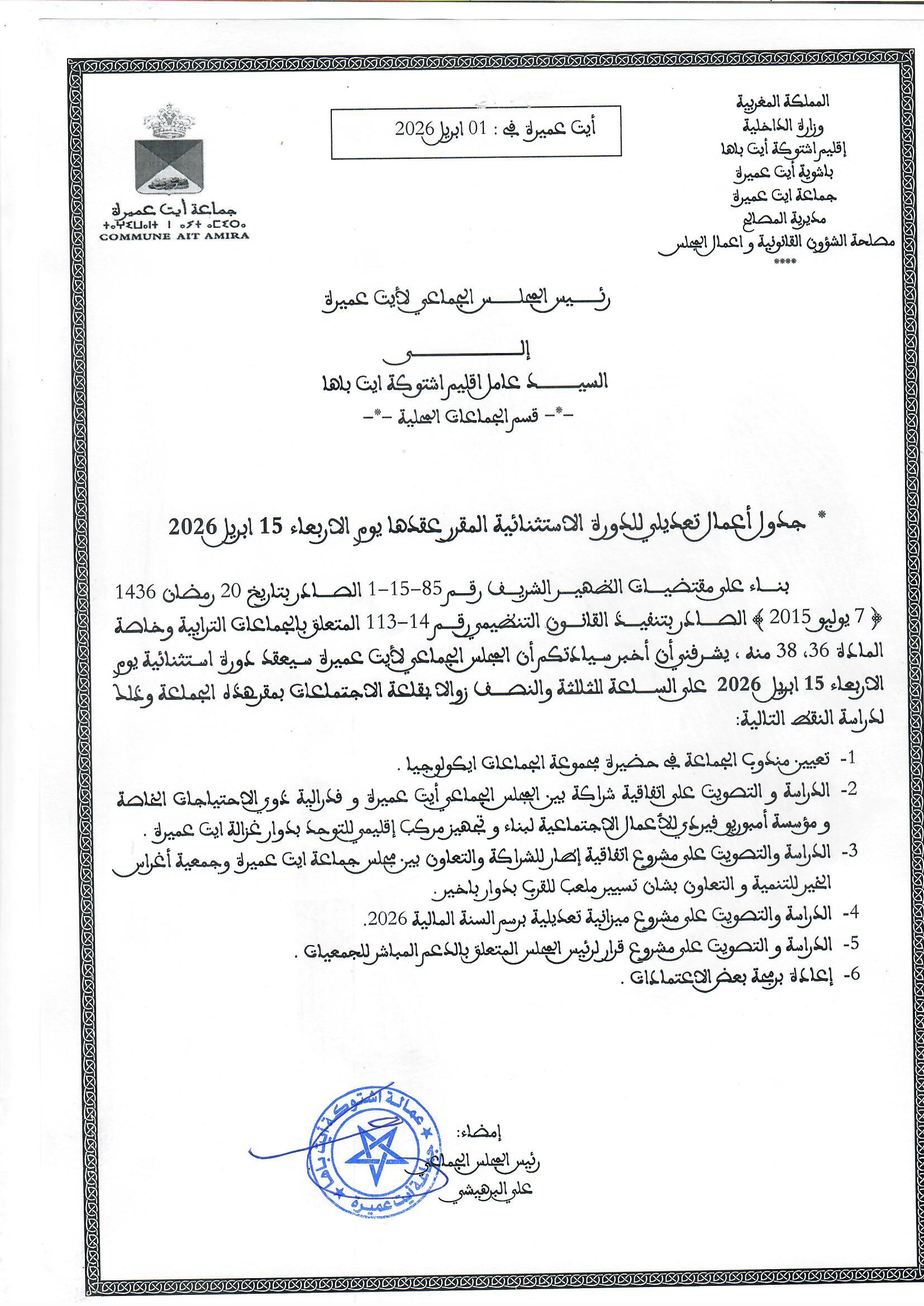 جدول أعمال تعديلي للدورة الإستثنائيةالمزمع عقدها بتاريخ 15 أبريل 2026.